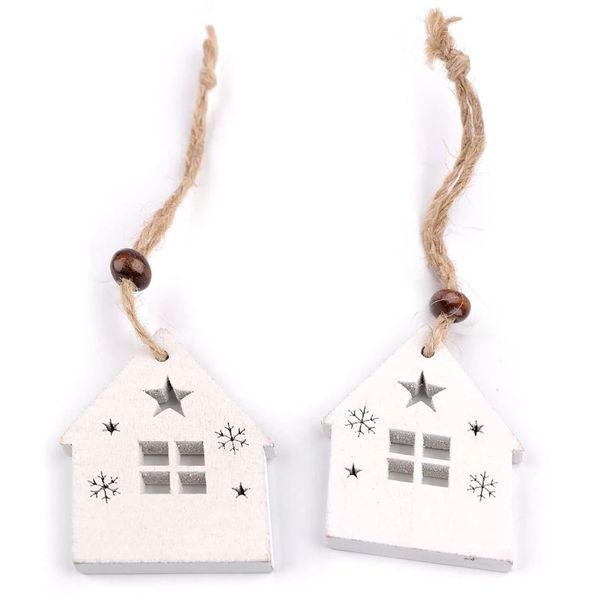 Dřevěné domečky vám ozdobí dekorační věnce, vánoční stromeček, větvičky ve váze i zabalené dárky. Mají v sobě působivé výřezy a jutové poutko na zavěšení.