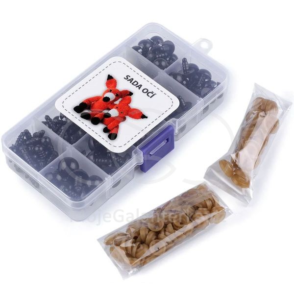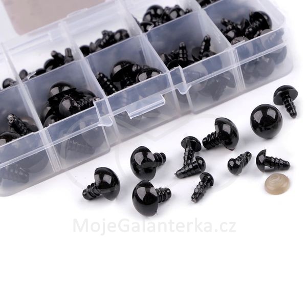 Souprava černých polokulatých bezpečnostních očí je ideální pro kreativce, kteří rádi vyráběji zvířátka a dekorační postavičky. Mají závit, který se provleče materiálem, a z druhé strany se pak nacvakne pojistka, která oči bezpečně připevní na místo. Vše je roztříděné a uložené v praktické krabičce s přihrádkami.